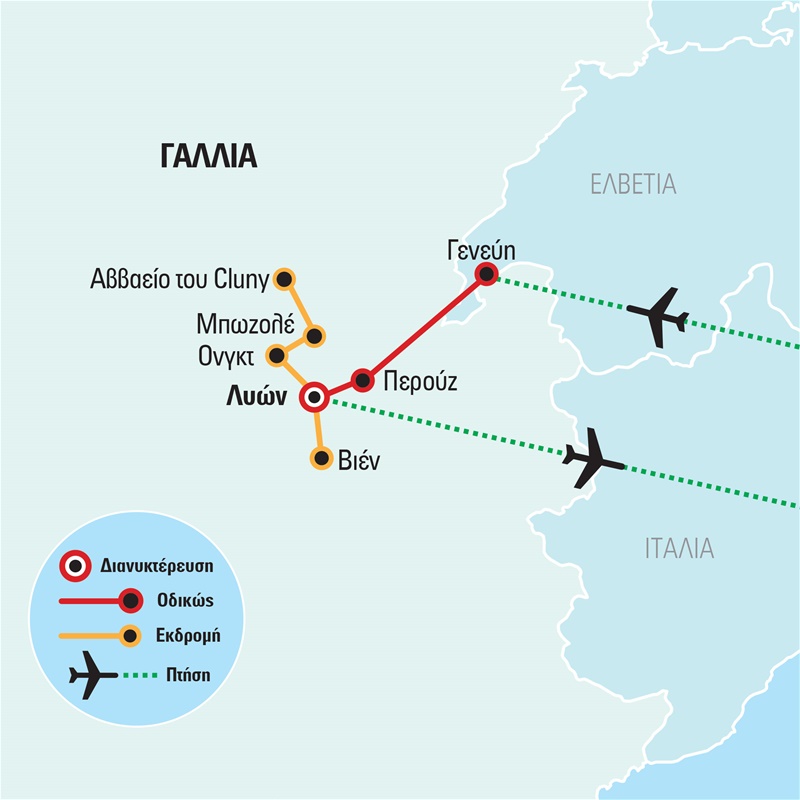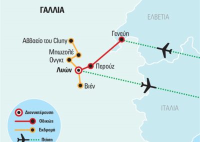 Το ταξίδι μας ξεκινάει από τη Λυών. Θα μεταβουμε στην πλατεία Φουρβιέρ, με τη βασιλική εκκλησία και τη θέα στην κοιλάδα του Ροδανού. Πολύ κοντά βρίσκεται το Γαλλο-Ρωμαϊκό Μουσείο στο οποίο θα ξεναγηθούμε. Στη βόλτα μας θα περάσουμε και από τα περίφημα «μυστικά περάσματα» με τις στοές και τις αλλεπάλληλες σκάλες, μία αρχιτεκτονική ιδιαιτερότητα της Λυών που έχει καταγραφεί στον κατάλογο μνημείων της UNESCO. Ακολουθεί εκδρομή στο μεσαιωνικό χωριό Περούζ, στην κορυφή ενός λόφου από όπου θα εποπτεύσουμε ολόκληρη την κοιλάδα του Ροδανού. Επόμενη εκδρομή η ρωμαϊκή πόλη Βιέν, στην αριστερή όχθη, όπου θα δούμε τον ναό του Αυγούστου, το αρχαίο θέατρο και τον αρχαιολογικό χώρο. Και μετά σειρά έχουν τα γραφικά οινοχώρια. Πρώτη στάση το Ονγκτ, ένα μεσαιωνικό χωριό που σήμερα φιγουράρει στον κατάλογο με «Τα Ωραιότερα Χωριά της Γαλλίας». Συνεχίζουμε με επίσκεψη στην περιοχή Μπωζολέ, όπου στο Chateau de Courcelles θα δοκιμάσουμε κρασί από την τοπική παραγωγή. Επόμενη στάση μας, το Αββαείο του Κλινύ, η έδρα του μεγαλύτερου μεσαιωνικού μοναστικού τάγματος στη Δυτική Ευρώπη.
