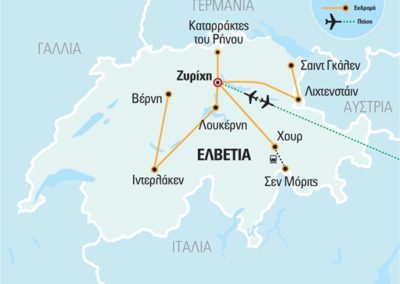 Στη Ζυρίχη, την καρδιά του ελβετικού «ρολογιού», την πιο εορταστική περίοδο, αυτή των Χριστουγέννων. Ένα πρόγραμμα με βάση τη χαρούμενη και φαντασμαγορική Ζυρίχη για τις περιηγήσεις μας στα πέριξ αξιοθέατα. Από εδώ θα εξερευνήσουμε μαζί τη χριστουγεννιάτικη και πρωτοχρονιάτικη αγορά και το ιστορικό κέντρο της πόλης, τους καταρράκτες του Ρήνου, και φυσικά πανέμορφες πόλεις όπως τη Λουκέρνη, το Ιντερλάκεν και την πρωτεύουσα Βέρνη. Ακόμη, θα θαυμάσουμε τα κατάλευκα βουνά με τα πανέμορφα τοπία και τις άψογα οργανωμένες χιονοδρομικές εγκαταστάσεις στο Σεν Μόριτς, φθάνοντας έως εκεί με το διάσημο αλπικό τρένο.