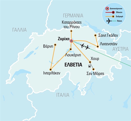 Συγκέντρωση στο αεροδρόμιο και πτήση για τη Ζυρίχη. Άφιξη και αναχώρηση για την ξενάγηση γνωριμίας μας με την πόλη, κατά τη διάρκεια της οποίας θα δούμε, μεταξύ άλλων, τη διεθνούς φήμης λεωφόρο με τις μεγάλες τράπεζες και τα μοντέρνα καταστήματα, την Μπανχοφστράσσε, τον Καθεδρικό Ναό, τον Ναό Φραουμίνστερ με τα βιτρό του Σαγκάλ, το Δημαρχείο, την Εκκλησία του Αγίου Πέτρου με τον μεγαλύτερο δίσκο ρολογιού στην Ευρώπη (με διάμετρο 8,7 μ.!), την πλατεία Μινστερχόφεν με τα διακοσμημένα σπίτια των συντεχνιών και το Λίντερχοφ, την ιστορική τοποθεσία του ρωμαϊκού και μεσαιωνικού κάστρου με τον περίφημο τάφο, στον οποίο αναγράφεται η λέξη Turicum, που λέγεται ότι μετεξελίχθηκε σε Zurich (Ζυρίχη). Μεταφορά και τακτοποίηση στο πολυτελές μας ξενοδοχείο. Διανυκτέρευση.